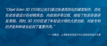 StrataSyS 3D 打印機(jī)幫助上海家化加速包裝容器模型制作,縮短研發(fā)周期,提升創(chuàng)新效率?!癘bjet Eden 3D 打印機(jī)讓我們通過快速而簡化的模型制作,優(yōu)化包裝容器設(shè)計(jì)的初稿篩選、內(nèi)部測評等過程,縮短了包裝容器研發(fā)周期。同時(shí), 3D 打印促進(jìn)了年輕設(shè)計(jì)師的大膽創(chuàng)新,對新專利的開發(fā)和申請也起到了重要作用。 ”——湯魯吉,上海家化包裝設(shè)計(jì)中心造型結(jié)構(gòu)設(shè)計(jì)主管包裝設(shè)計(jì)是品牌理念的 “敘述者” ,是產(chǎn)品精髓的體現(xiàn),是打動消費(fèi)者的武器。對于以 “美”為目標(biāo)的化妝品行業(yè)來說,包裝容器更是美的載體。一款精美、獨(dú)特的包裝容器能為消費(fèi)者帶來充滿美麗和愉悅的第一印象、使用體驗(yàn)和持有感。化妝品包裝因而成為化妝品生產(chǎn)商爭先贏得競爭力的重要領(lǐng)域。