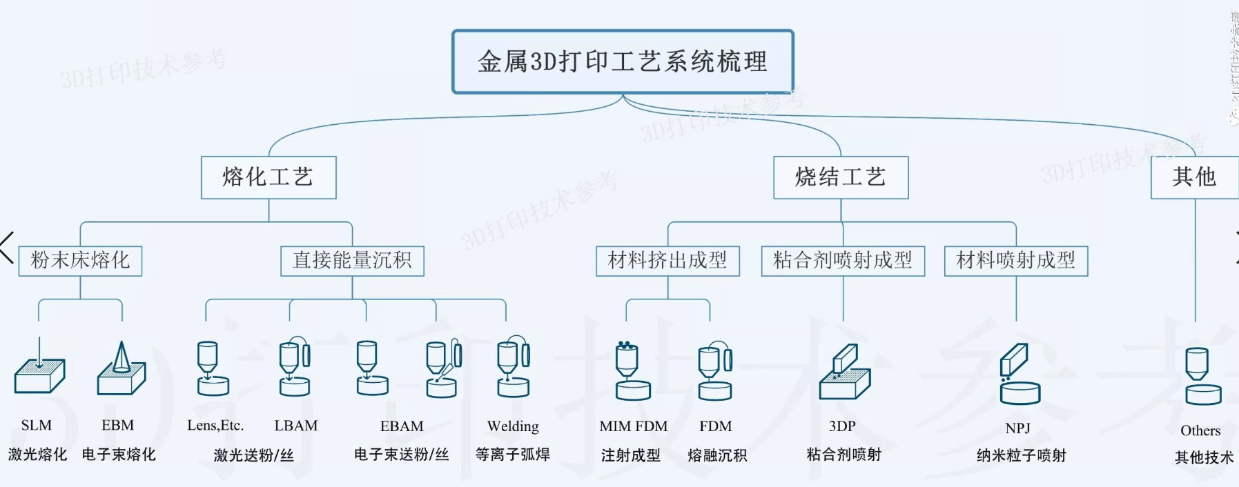技術(shù)的多樣性也為給定的應(yīng)用選擇技術(shù)類型帶來了困難,下圖展示了在考慮ISO/ASTM 52900標(biāo)準(zhǔn)的同時(shí)對(duì)不同金屬增材制造技術(shù)進(jìn)行分類的結(jié)果。當(dāng)前金屬3D打印技術(shù)主要分為熔化工藝和燒結(jié)工藝兩種。