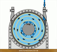 特斯拉渦輪機(jī)是20世紀(jì)初由尼古拉?特斯拉(Nikola Tesla)申請(qǐng)專利的無葉片向心流渦輪機(jī)。像葉片式渦輪機(jī)一樣,它通過流體的流動(dòng)轉(zhuǎn)換成能量。其使用平滑的平行圓盤,而非角度葉片來驅(qū)動(dòng)傳動(dòng)軸旋轉(zhuǎn)。流體進(jìn)入渦輪機(jī)外緣的圓盤與其作相切運(yùn)動(dòng),通過流體粘性和表面層的附著力強(qiáng)制渦輪旋轉(zhuǎn)。當(dāng)流體減速并失去能量時(shí),它向渦輪的中心旋轉(zhuǎn)并通過排氣口排出。下面的GIF顯示了特斯拉渦輪機(jī)中的流體運(yùn)動(dòng)和能量傳遞的過程。