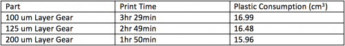 這是FFF技術(shù)打印的一個(gè)經(jīng)典分析點(diǎn):層分辨率與打印時(shí)間。 我們默認(rèn)的100微米層分辨率可以產(chǎn)生高質(zhì)量的表面光潔度。將層高增加到200微米會(huì)犧牲一點(diǎn)表面質(zhì)量,但同時(shí)可以減少一半的打印時(shí)間。這對(duì)于臨時(shí)應(yīng)急且僅用于塑料的3D打印項(xiàng)目(使用光纖進(jìn)行打印需要100或125微米的固定層高)非常有用,因?yàn)槟牧慵梢栽谠械臅r(shí)間內(nèi)打印出兩個(gè)零件。請(qǐng)參閱下表,了解先前分析的齒輪在不同層高設(shè)定下的時(shí)間估算。