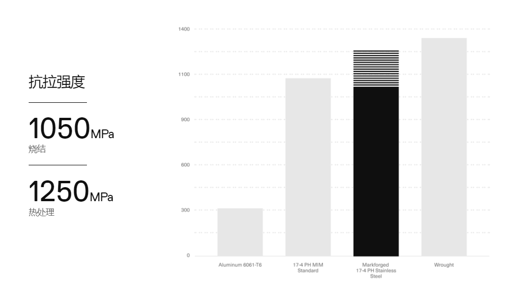 Values listed below compare Markforged samples processed in three different ways: As-Sintered, heat treated to H900 standard, and heat treated to H1150 standard.