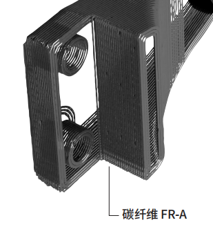 碳纖維 FR 屬于連續(xù)纖維增強(qiáng)材料。通過 Markforged 復(fù)合打印頭上的第二個(gè)噴嘴鋪設(shè)在零件內(nèi)部。該材料無法獨(dú)立用于打印,而是用于增強(qiáng)采用 Onyx FR 等復(fù)合基材打印的零件。