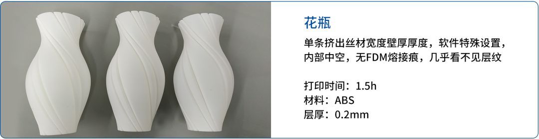 層厚優(yōu)勢 HAGE 175C 3D打印機可以更換不同噴嘴設(shè)置不同的打印層厚。以花瓶為例,使用175C的FFF(熔融擠出)技術(shù)打印出的花瓶零件,層厚200微米,但并不影響零件表面的質(zhì)量;甚至可以嘗試設(shè)置更小的50微米層厚,獲得更高的打印質(zhì)量。