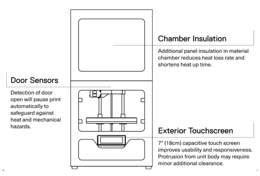 觸摸屏被重新安置在打印室之外,以減少接觸移動或加熱組件的風險。該打印機還裝配了門位置傳感器,當門打開時自動暫停打印作業(yè)。改進的腔室絕熱性縮短了預熱時間,提高了打印的一致性。