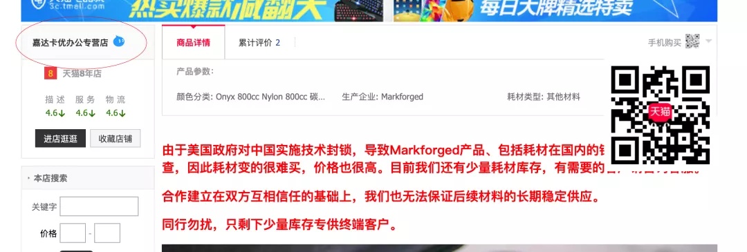 鑒于目前有各行各業(yè)用戶向我們投訴:個別公司冒用Markforged公司授權代理商(VAR)的名義違規(guī)銷售來源不明的Markforged 3D打印機,打印材料以及質(zhì)保,給客戶造成極大困擾,并給Markforged品牌帶來負面影響,為此我們特作出如下鄭重聲明,并保留對任何冒用行為的所有后續(xù)追訴的法律權利。 聲明一 安徽嘉達卡優(yōu)辦公專營店(天貓網(wǎng)店)不是Markforged的授權代理商,該公司在其網(wǎng)站及展會所展示的所有 Markforged的產(chǎn)品均未經(jīng)Markforged公司授權。 上圖信息不屬實,請慎重! 聲明二 Markforged沒有任何網(wǎng)上的直營銷售渠道。 聲明三 我們對任何未經(jīng)授權的第三方銷售的Markforged公司生產(chǎn)的機器、配件及耗材不承諾任何質(zhì)保和售后,提醒您注意選擇合法授權的供貨渠道。 特此聲明! 本次聲明最終解釋權歸Markforged所有。