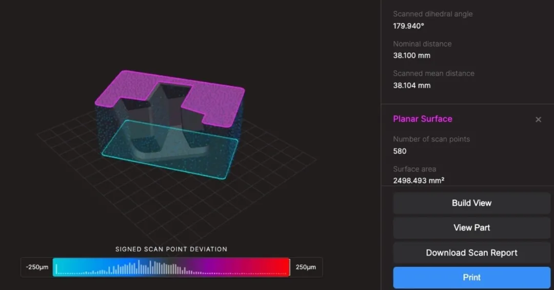 在發(fā)布會上,Blacksmith為用戶提供了低、中或高密度的掃描選擇,改變了生成點(diǎn)的分辨率,可以比較打印出來的零件和設(shè)計(jì)出來的零件,這種掃描密度的選擇適用于整個(gè)零件。有了新的可變掃描密度,用戶能夠自主選擇整體掃描密度,然后直觀地確定以不同密度水平掃描的一組或多組零件特征。例如,可以選擇高密度來檢查和分析一個(gè)小的復(fù)雜零件特征,而低或中等密度可以滿足其他零件特征,滿足用戶對更高分辨率的掃描和檢查的需求,以及對整體打印和掃描時(shí)間的要求,實(shí)現(xiàn)更高的零件產(chǎn)量。另外,Blacksmith還可以從數(shù)據(jù)中了解到哪些零件是客戶真正需要的。