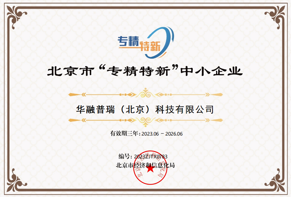 華融普瑞(北京)科技有限公司成功申領(lǐng)到由北京經(jīng)濟和信息化局頒發(fā)的北京市“專精特新”中小企業(yè)證書。