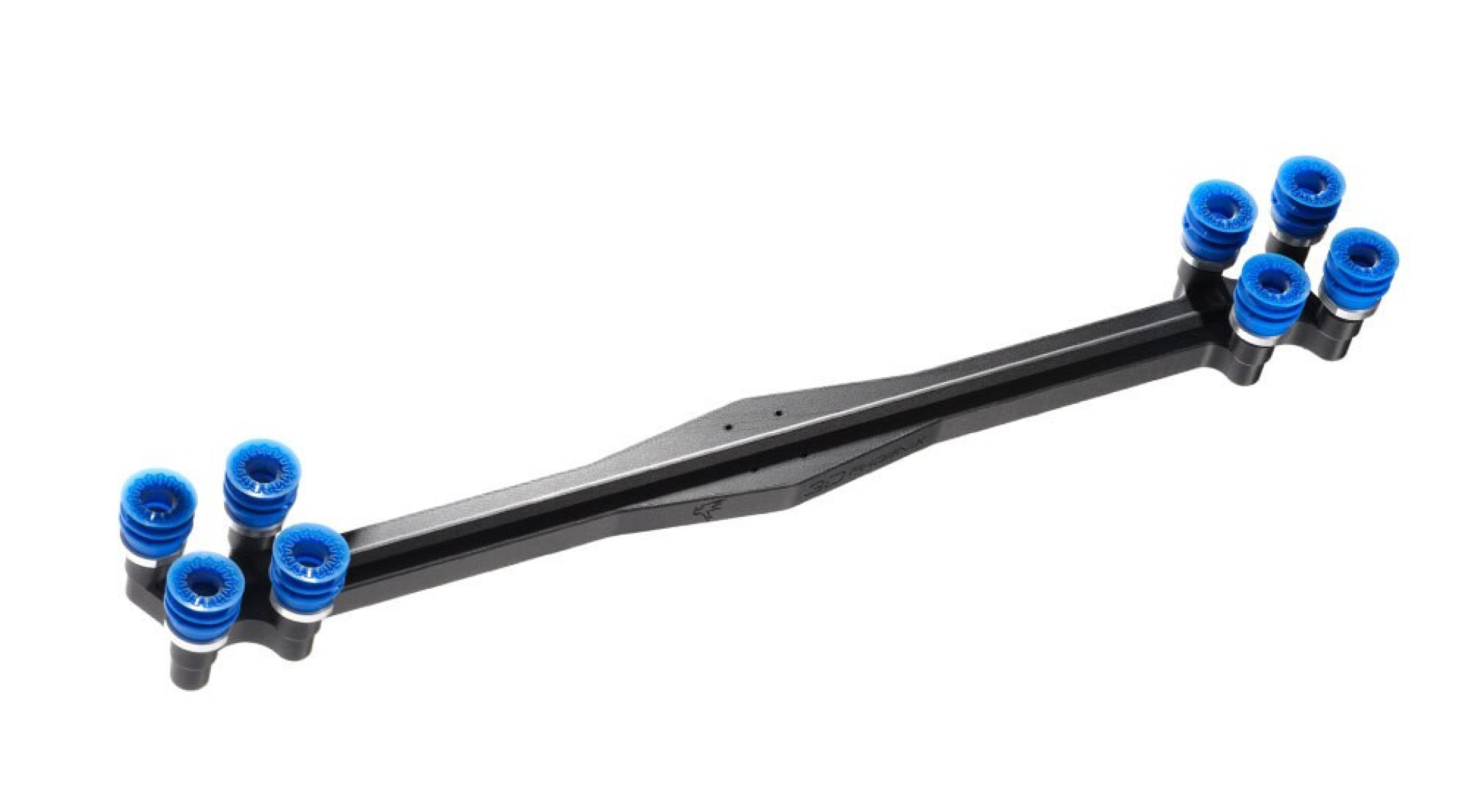 吸盤(pán)式夾爪用于生產(chǎn)線(xiàn)上最后的包裝環(huán)節(jié),可將單位容器運(yùn)送到零售包裝盒中。由于夾持點(diǎn)之間的距離取決于最新的產(chǎn)品和包裝盒形狀,通過(guò)增材制造技術(shù)制作 EOAT,制造團(tuán)隊(duì)便能夠根據(jù)最新要求即時(shí)調(diào)整夾爪長(zhǎng)度,并且不會(huì)額外增加重量。在內(nèi)部制造此零件,可以避免因等待供應(yīng)商運(yùn)送定制零件而造成的延誤。因此,使用 Onyx 生產(chǎn)零件可以加快零件制造速度,降低總成本,同時(shí)減輕包裝機(jī)器人的重量(從而降低負(fù)荷)。