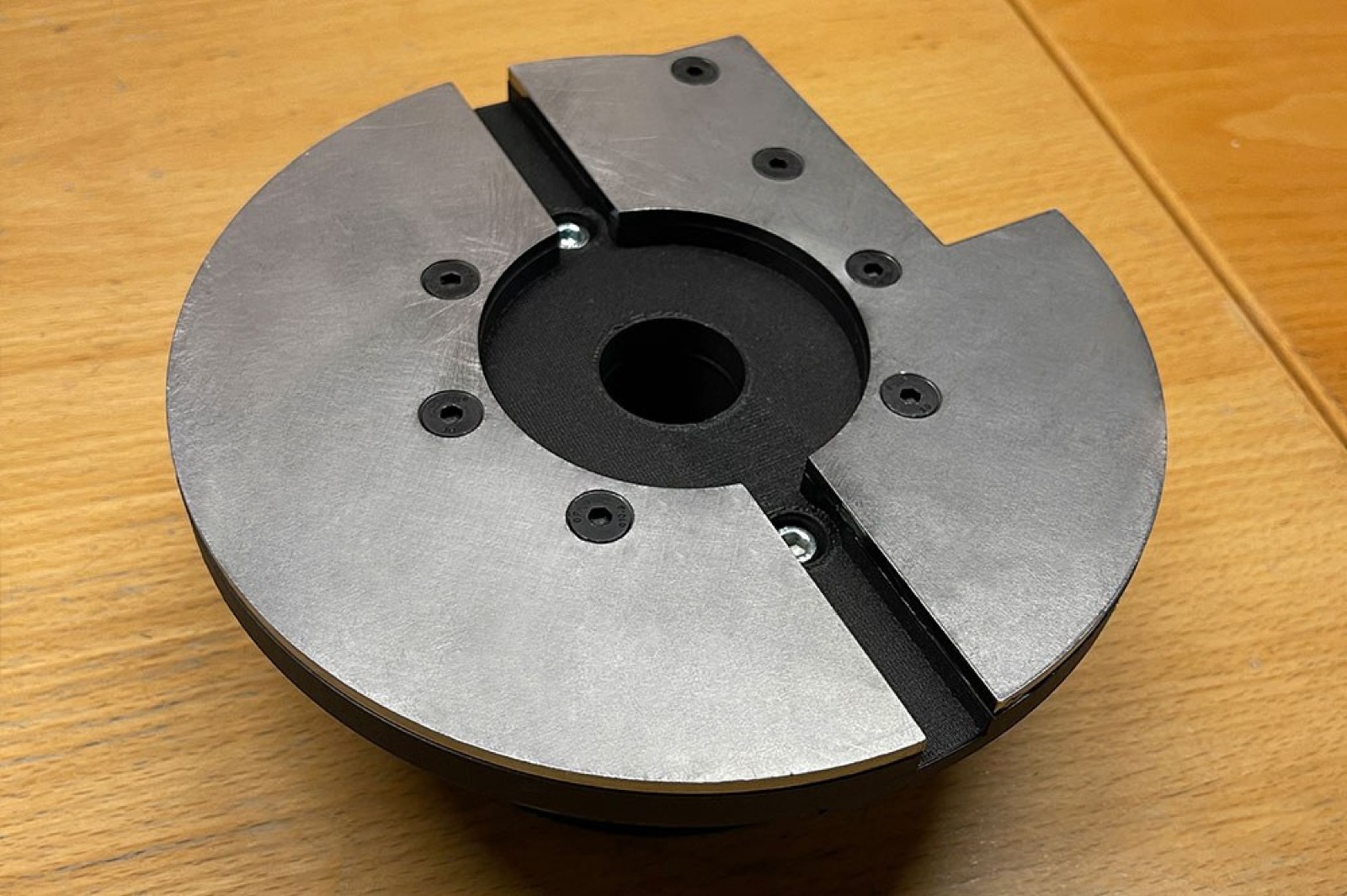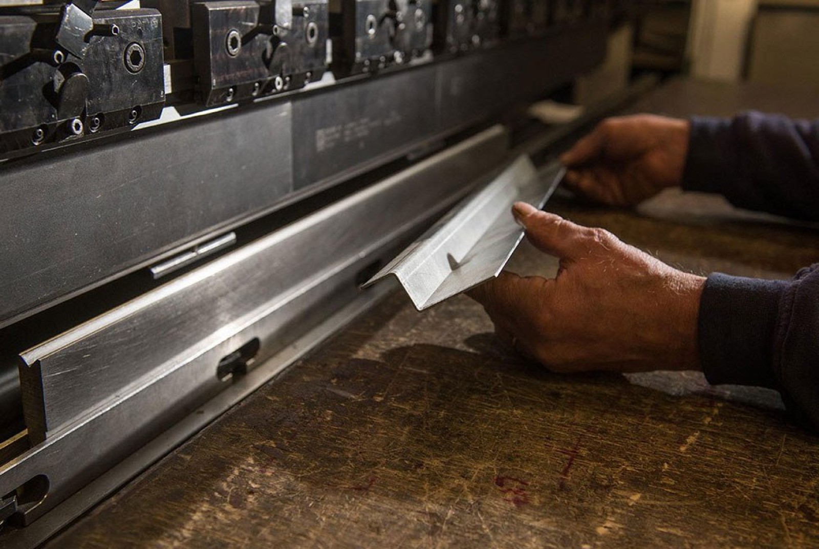 3D 打印的折彎模具,附有金屬板。該模具通過長長的凹槽安裝到折彎機(jī)上,金屬板幫助承受折彎過程中施加在模具上的扭矩