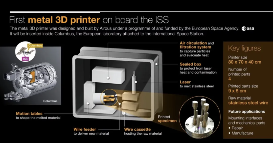 這臺金屬3D打印機(jī)由空中客車公司及其合作伙伴在歐洲航天局(ESA)的資助下開發(fā),于2024年1月運(yùn)抵國際空間站。該打印機(jī)的設(shè)計(jì)目標(biāo)是展示在微重力環(huán)境下生產(chǎn)金屬部件的可行性。2024年5月,打印機(jī)在國際空間站的哥倫布實(shí)驗(yàn)艙成功安裝,并在ESA宇航員Andreas Mogensen的指導(dǎo)下完成首次運(yùn)行。