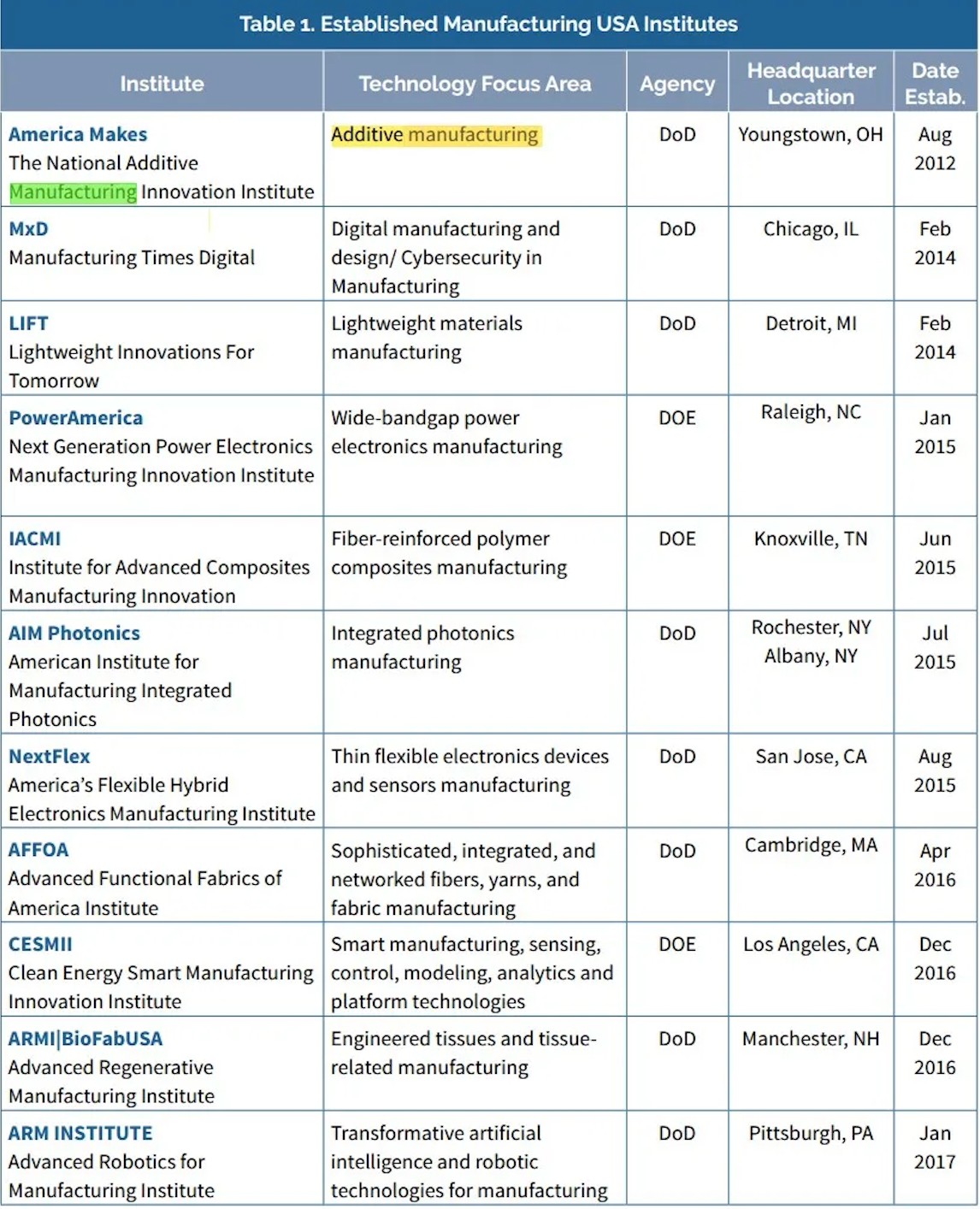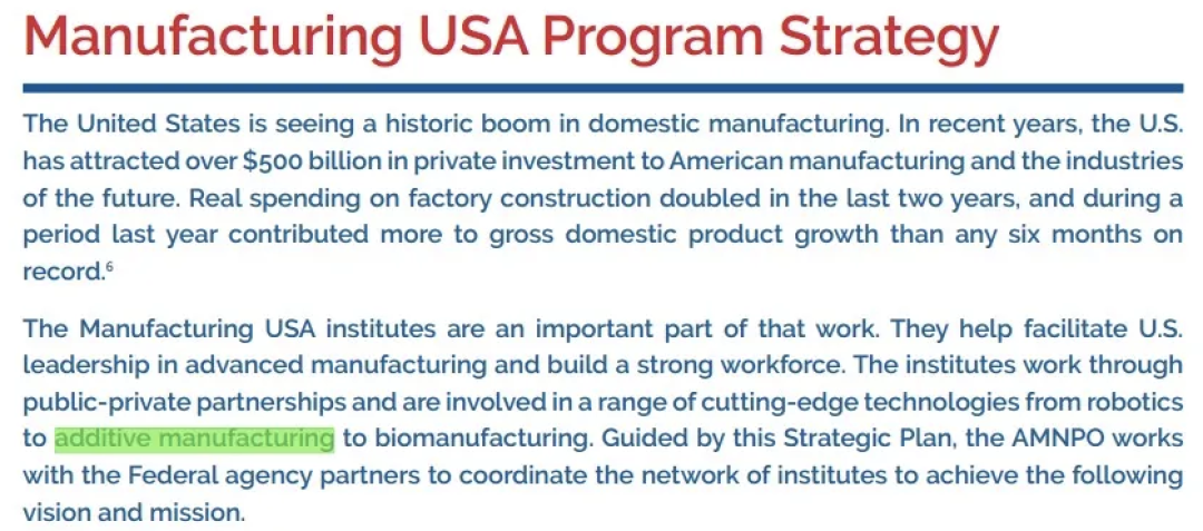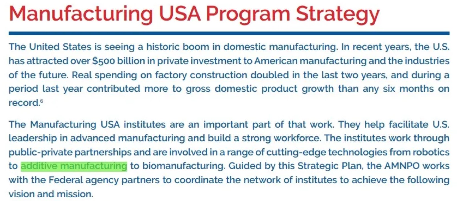此項計劃重點關注了先進制造技術,計劃指出美國制造業(yè)協(xié)會研究所將通過公私合作伙伴關系開展工作,涉及從機器人到增材制造再到生物制造等一系列尖端技術。計劃明確了增材制造(Additive Manufacturing,AM)等核心技術創(chuàng)新方向的重要地位。依托“America Makes”國家增材制造創(chuàng)新研究所,美國致力于推動增材制造技術研發(fā)、行業(yè)應用和人才培養(yǎng),為強化國內制造業(yè)競爭力與供應鏈韌性奠定基礎。
