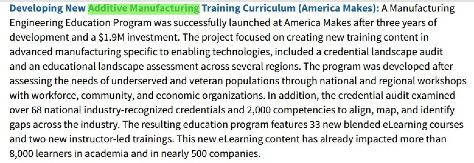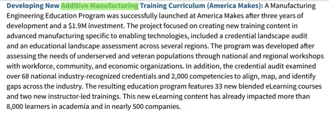 美國未來增材制造的主力發(fā)展方向 課程教育和人才培養(yǎng):為了滿足增材制造行業(yè)對高技能勞動力的需求,計劃強調了教育和培訓的重要性。經(jīng)過三年的發(fā)展和190萬美元的投資,美國制造成功推出了制造工程教育計劃(A ManufacturingEngineeringEducationProgram)。項目重點是在先進制造業(yè)中創(chuàng)建新的培訓內容,具體到使能技術,包括在幾個地區(qū)進行證書景觀審核和教育景觀評估。該計劃是在通過與勞動力、社區(qū)和經(jīng)濟組織舉行的國家和區(qū)域研討會評估服務不足人口和退伍軍人的需求后制定的。