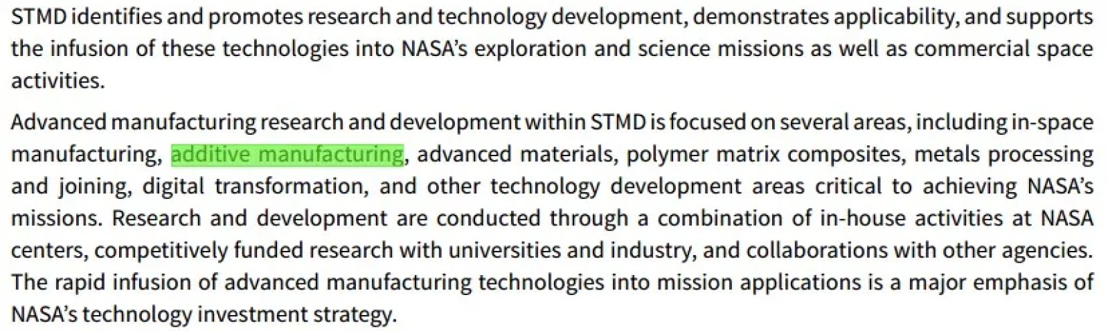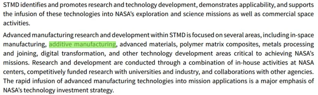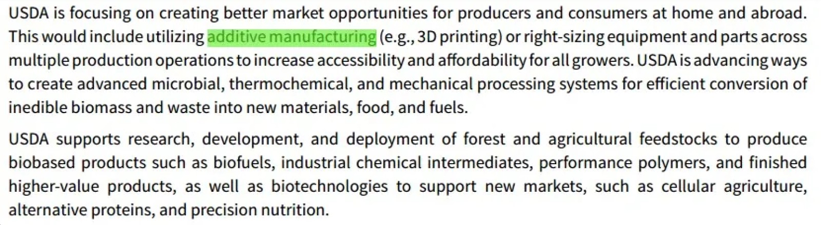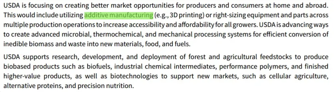 航空航天:空間技術任務理事會(STMD)是美國宇航局(NASA)與美國制造業(yè)關系最密切的組織。STMD投資于變革性技術,以幫助抵消未來的任務風險,降低成本,提高NASA任務的能力,并支持航天工業(yè)的增長和高質量的就業(yè)機會。計劃中在提及STMD的部分指出:STMD先進制造研究和開發(fā)主要集中在幾個領域,包括空間制造、增材制造、先進材料、聚合物基復合材料、金屬加工和連接、數(shù)字轉換以及其他對實現(xiàn)NASA任務至關重要的技術開發(fā)領域。研究和開發(fā)是通過NASA中心的內部活動、與大學和工業(yè)界競爭資助的研究以及與其他機構的合作來進行的。將先進制造技術快速注入到任務應用中是NASA技術投資戰(zhàn)略的主要重點。 農業(yè):美國農業(yè)部正致力于為國內外的生產者和消費者創(chuàng)造更好的市場機會。這將包括在多個生產操作中使用增材制造構件或適當尺寸的設備和部件,以提高所有種植者的可及性和可負擔性。美國農業(yè)部正在推進創(chuàng)造先進的微生物、熱化學和機械加工系統(tǒng)的方法,以便將不可食用的生物質和廢物有效地轉化為新材料、食品和燃料。