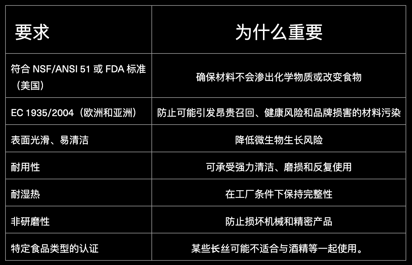 并非所有細絲都生來相同。以下列出了適合在工業(yè)環(huán)境中與食品接觸的材料: