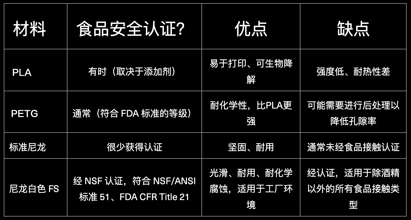 下面我們來看看一些常見材料在食品工業(yè)應用中的 3D 打印的安全性、性能和可用性方面的表現(xiàn):