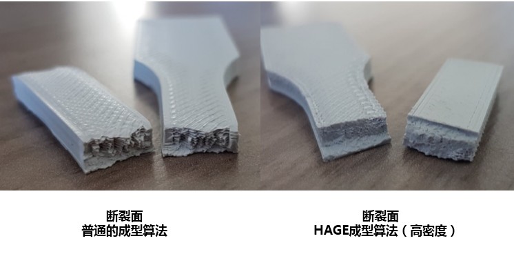 第四,HAGE FDM技術(shù)3D打印機采用高密度成型算法減弱了各項異性,提高了3D打印零件的使用工況。傳統(tǒng)的FDM型3D打印機采用的普通成型算法斷裂面有明顯的層與層連接的紋理,而憑借HAGE強大的軟件研發(fā)能力,開發(fā)出一種全新的成型算法,它的斷裂面減弱了層與層結(jié)合的紋理,做到了基本各向同性,解決了傳統(tǒng)Z方向性能弱的缺點,提高了零件的應(yīng)用領(lǐng)域。當(dāng)然HAGE還有很多的其它的優(yōu)點,就不一一介紹了。
