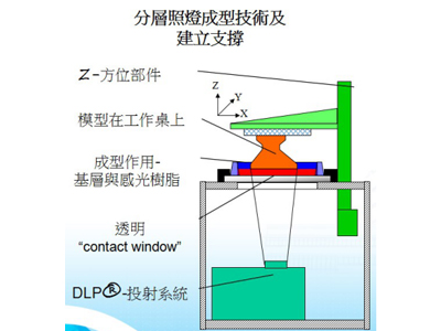 Perfactory系統(tǒng)是利用直接照燈成型技術(shù)DLP(Digital Light Processing)把感光樹脂成型,CAD的數(shù)據(jù)由其自帶的計算機軟件Perfactory software Suite + Envisiontec Magics進行分層及建立支撐,再輸出黑白色的Bitmap檔。每一層的Bitmap檔會由DLP投影機投射到工作臺上的感光樹脂,使其逐層固化成型。