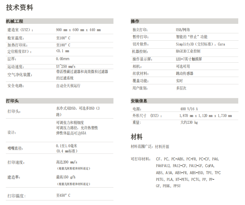 HAGE在機械工程領域擁有超過30年的經驗,使得HAGE 3D打印機Mex two成為一款高性價比、材料種類多且開源、精度高的全能型工業(yè)級3D打印機。其采用高度動態(tài)的FFF快速成型工藝,保證細節(jié)精度高達0.1mm,定位精度高達0.1mm。 該模型成型倉空間加熱可高達100°C、打印溫度高達450°C,是適用于所有普通長絲(如工程塑料和金屬長絲)的新型雙打印頭3D打印設備。同時Mex two的成型尺寸為900 mm x 600 mm x 440 mm,滿足大尺寸零部件生產制造。