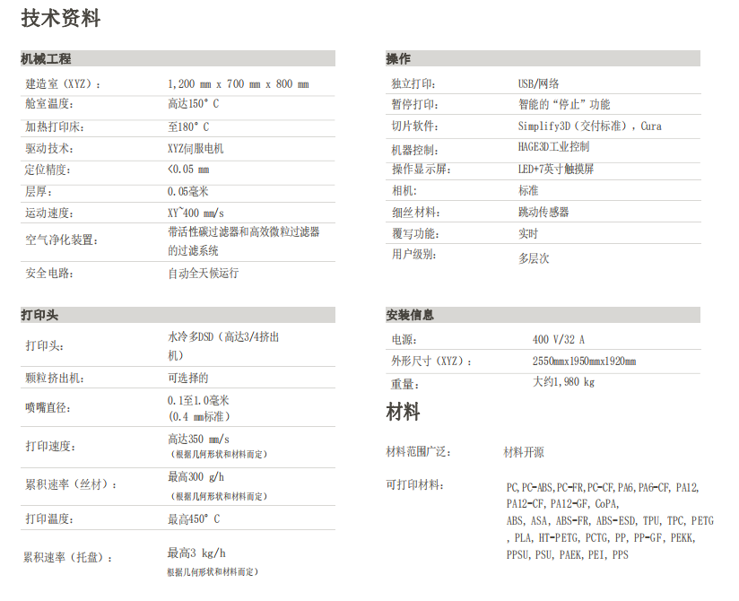 HAGE 3D打印設備是集非金屬及金屬以及陶瓷打印為一體的高速打印設備;超大成型尺寸能滿足汽車、航空航天等工業(yè)化應用場景,五軸聯(lián)動能夠有效的免除支撐,提高打印速度;獨家噴嘴水冷技術,實現(xiàn)打印噴頭永不堵頭,同時,HAGE的PRECISE系列還可以使用多達四個擠出機進行多重打印,一次最多可以打印四種不同的材料,可以同時組合打印不同硬度、不同顏色的材料,采用可溶性支撐材料,這是多材料技術的首例,或者作為替代,使用顆粒打印頭。