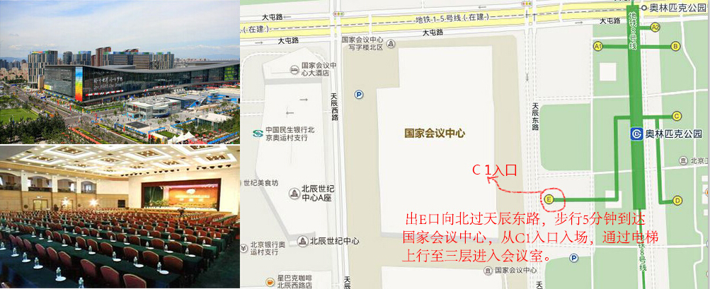 3、地鐵:地鐵8號(hào)線 奧林匹克公園站出E口,步行500到達(dá)國(guó)家會(huì)議中心,請(qǐng)行至C1入口,乘觀光梯到三層;